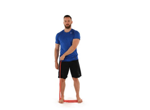 Stand up straight with an elastic strap beneath your foot and hold the ends of it in the opposite hand.