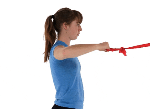Tie an elastic behind you at waist level. Hold the elastic tightly, with the palm facing forward. Your arm is horizontal beside you, with your elbow slightly bent. With your shoulders down and back, pull the elastic in front of you while keeping your elbow slightly bent and without moving the torso. Slowly return to the initial position and repeat.