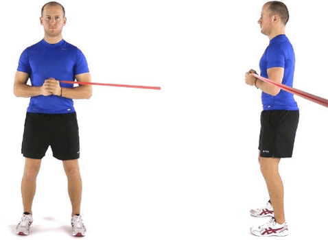 Hold an elastic band in your hands and attach it on the side at chest height. With tension in the elastic, extend your arms forward and then slowly bring your hands back toward your body. Your body must not rotate as you resist the pull of the elastic.