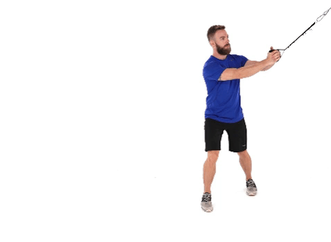 Stand next to a pulley station or affix a band to your side above shoulder height. The pulley should be set to start from the highest point. Hold the handle/end of band with both hands at face height. Pull the cable down and sideways across your body, rotating the shoulders and hips.